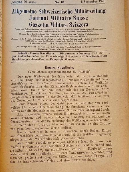 General Swiss Military Newspaper = Journal militaire suisse = Gazetta militare svizzera. Complete 1920 edition. Rare find!